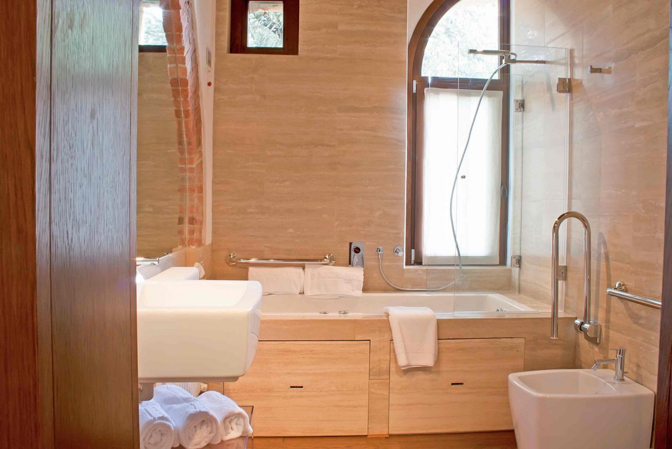 La nostra Camera Standard al piano terra è estremamente comoda e spaziosa (>30 m2) ed arredate con uno stile che fonde elementi tradizionali con altri dai toni decisamente più moderni. Come tutte le stanze, è dotata di soffitto in travi di legno ed una moderna pavimentazione in parquet, che conferiscono a tutto l'ambiente un'atmosfera decisamente elegante. Il bagno è spazioso, con vasca idromassaggio, specchio grande a parete e accessori per disabili. Nel servizio sono inclusi impianto autonomo di aria condizionata, televisione LCD con canali satellitari, free Wi Fi e mini bar.